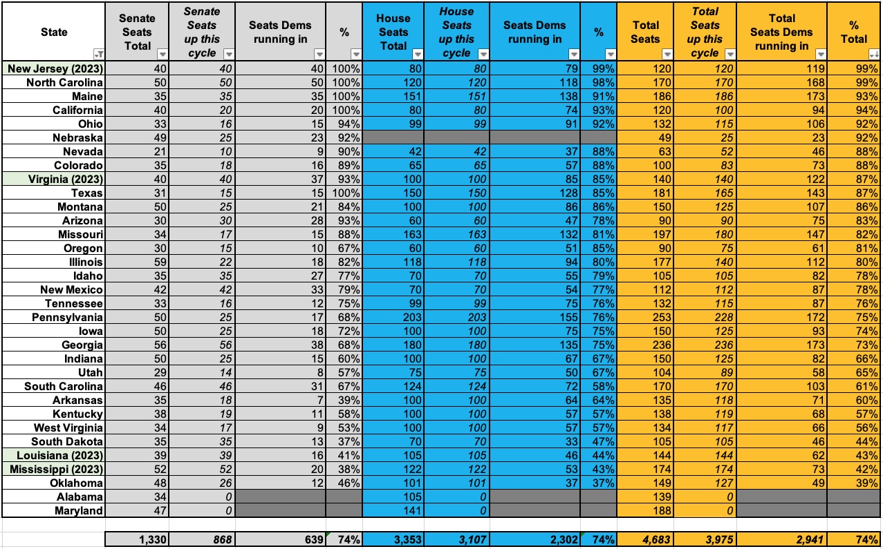 This ranges from as high as 99% in North Carolina (they filled all 50 Senate districts and are only missing candidates in 2 of the 120 House districts) to as low as a pathetic 39% in Oklahoma (which only managed to recruit Democrats for 12 of the 26 Senate races up this year and 37 of the 101 House districts).