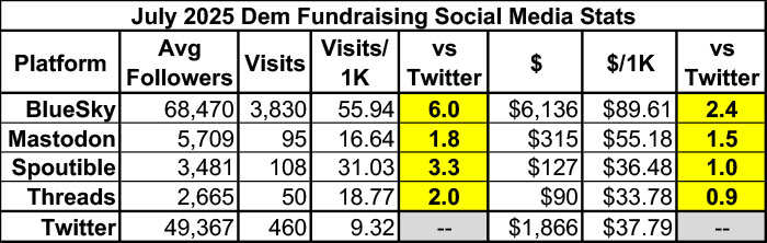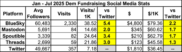 As for social media engagement, as you can see, on a per-follower basis, every other platform continues to kick Twitter/X's ass, with BlueSky generating 6x as many clickthrus per post and 2.4x as much in donations per follower.