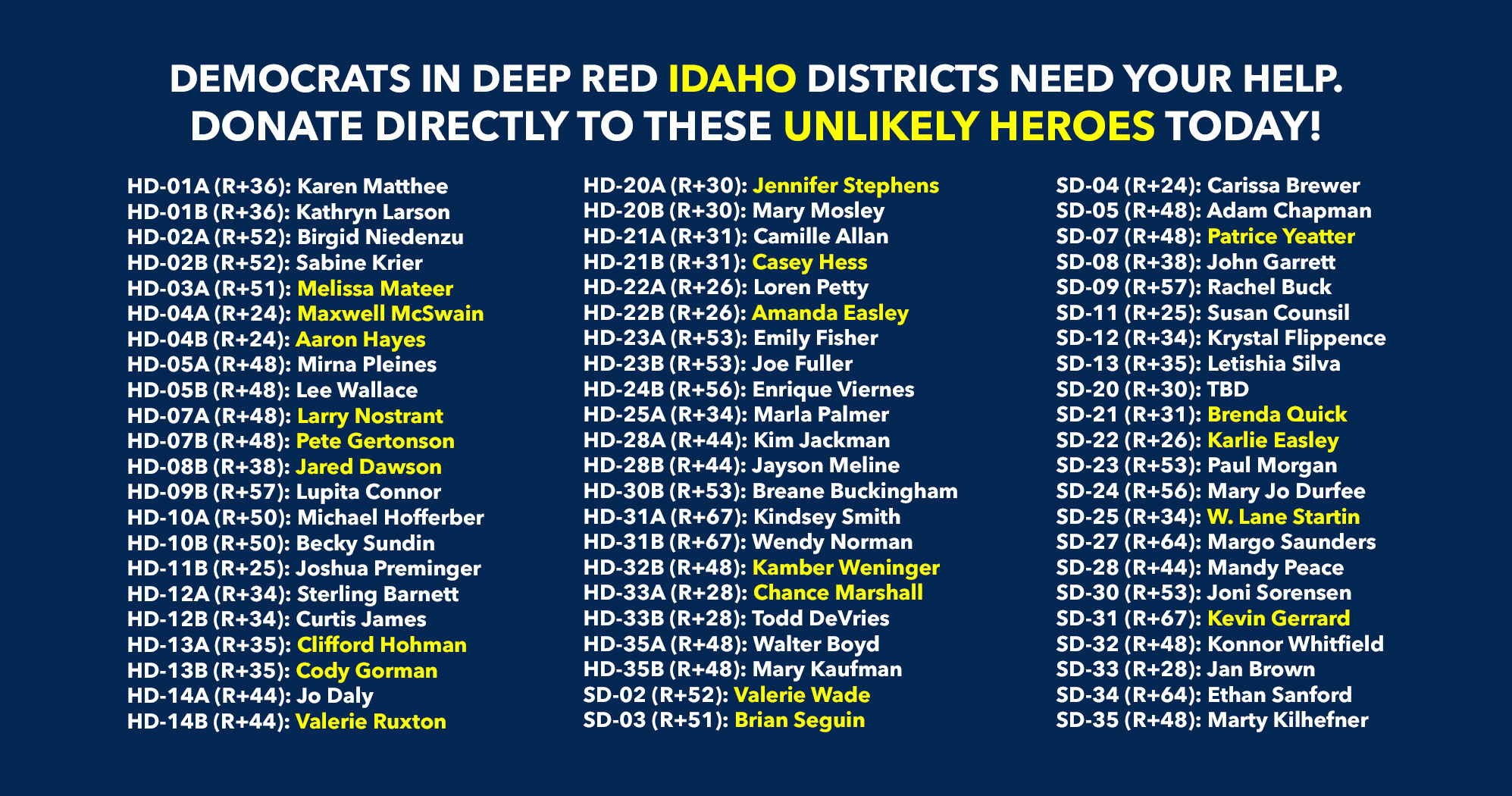 Donate to Democrats running in deep red districts to boost turnout & force Republicans to defend their turf!